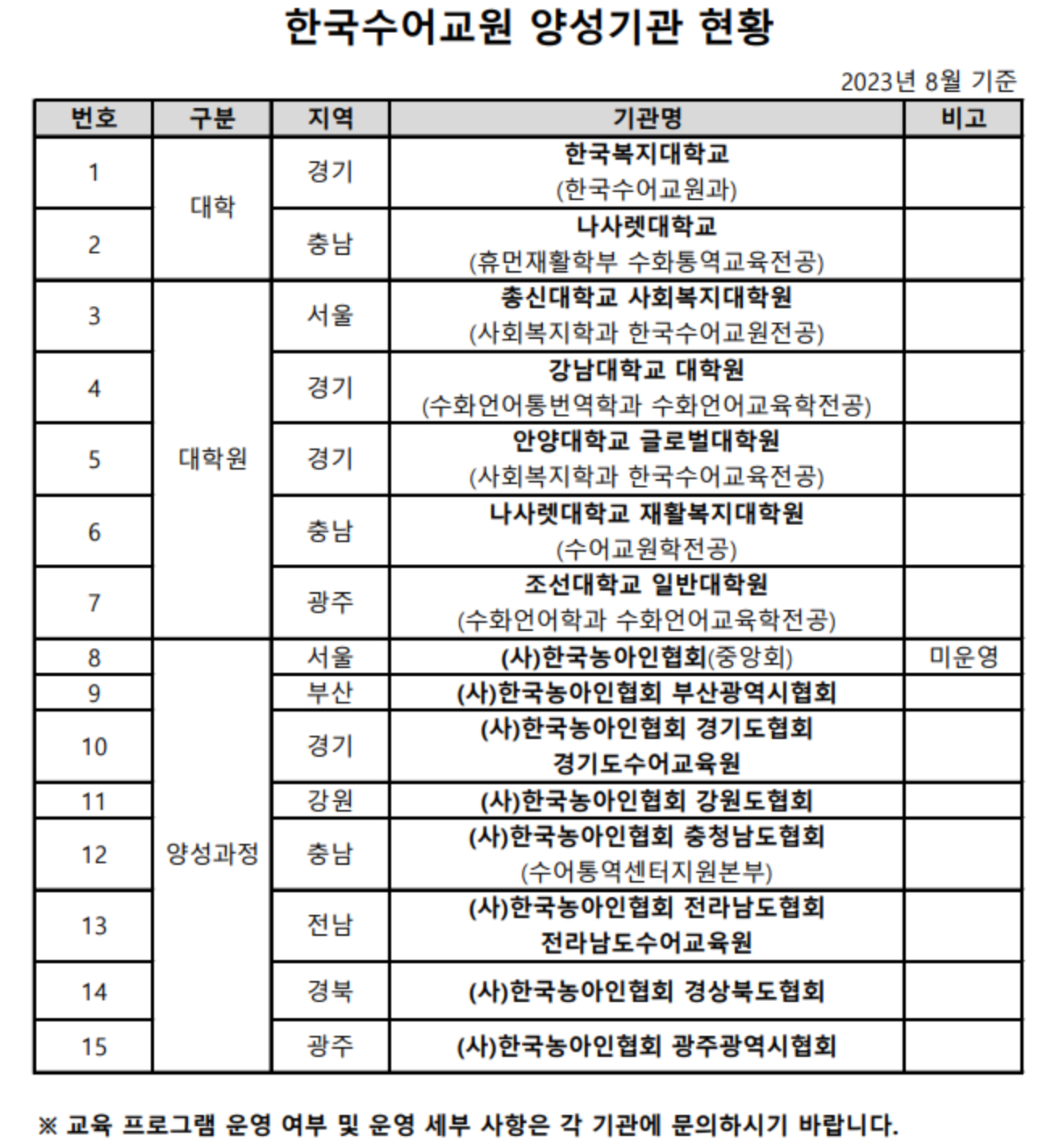 • 한국수어교원 양성과정 운영 기관(대학, 대학원, 양성기관)